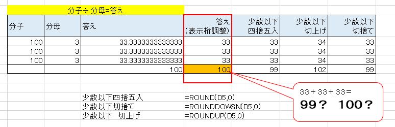 表示桁数は見た目の桁だけで、実際にExcelがそのセルで保持する桁数とは違うので合計結果の矛盾が生じます。(33+33+33=100)