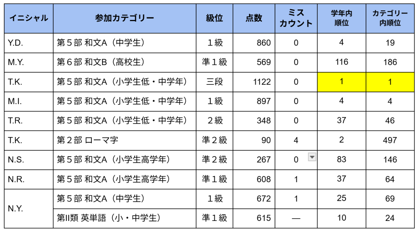 | イニシャル | 参加カテゴリー | 級位 | 点数 | ミス カウント | 学年内順位 | カテゴリー内順位 |