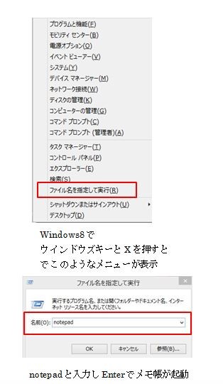 Windows7以前のOSならスタートボタンを押してす「ファイル名を指定して実行」を選択、Windows8なら、スタートボタン+Xを押して一覧から「ファイル名をして実行」へ進みます。