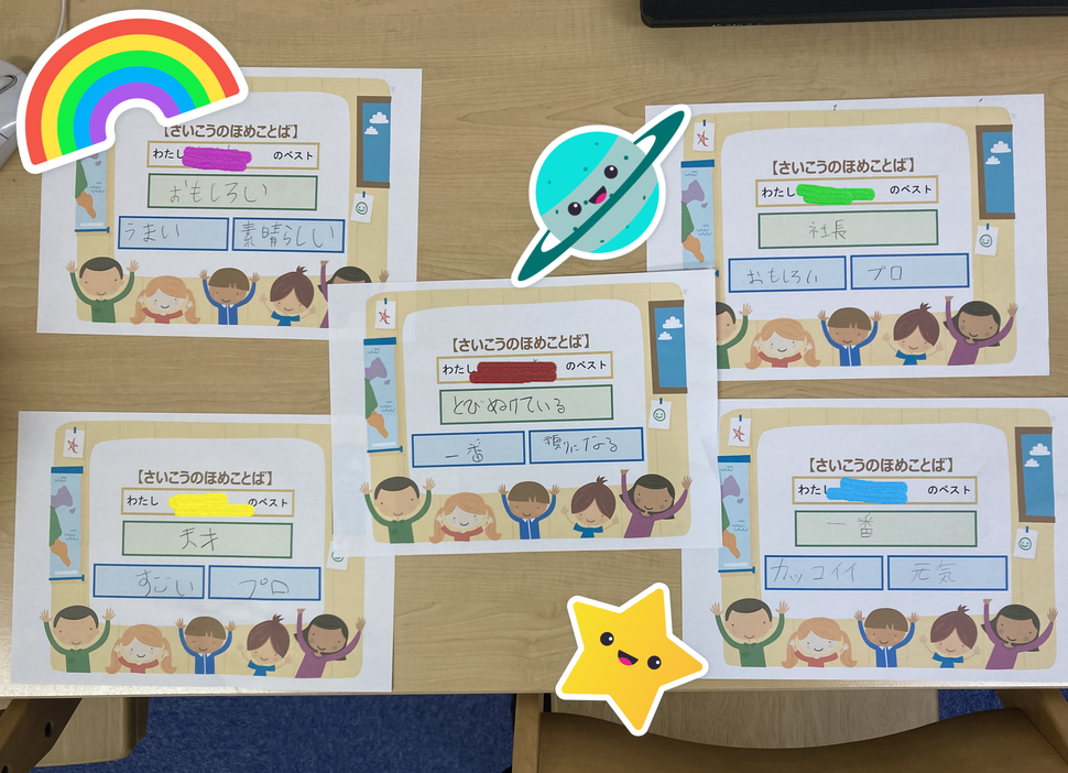 レッスンに来る子どもたちに、お母さんに、お父さんに、友だちに、先生から言ってもらいたい最高の褒め言葉ベスト3を選んで「さいこうのほめことば」シートを書いてもらっています。