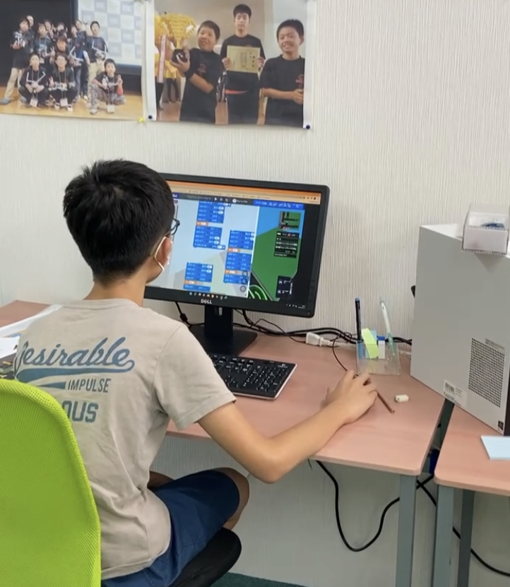 ユウトくんが力を発揮したシミュレーションロボット競技は、インターネット上の仮想のロボットをプログラムで操作し点数と速さ競う競技です。教室での口数は少ないですが、いいアイデアを形にする力も付き成長したなと感じる事が増えていました。