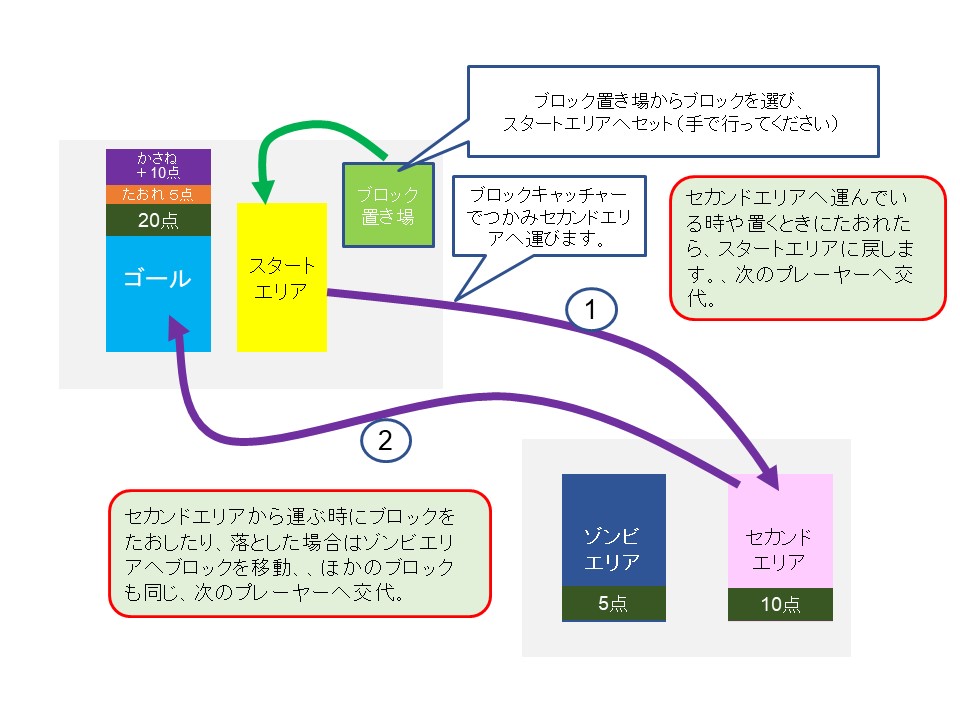 ブロックを運びます。ブロックはよりたくさん運んだ方が高得点になります。