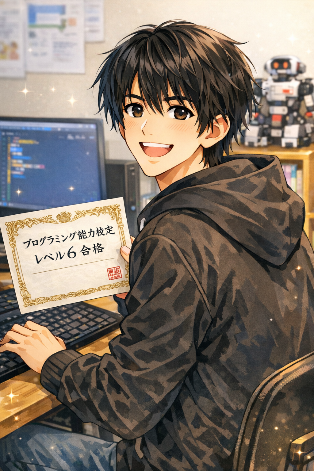 さらに、先日実施されたプログラミング能力検定レベル6において、満点合格という素晴らしい成果もあり、本日は表彰状の授与も行いました。努力を重ねてきた結果が形となり、本人の嬉しそうな表情を見ることができたことは、教室にとっても大きな喜びでした。