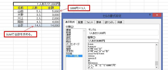 すると 「1000」と入力するとセルの表示が「1人あたり1,000円」