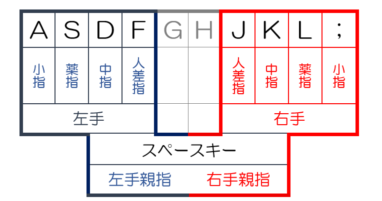 上下のキーを押す時に動きやすくするためです。この位置をホームポジションといいます。指を置く基本の場所です。上段の時には指を伸ばし、下段の時は更にまげて押します。それぞれの指が担当する、上下や左右のキーを押した場合、その指は素早くホームポジションに戻します。