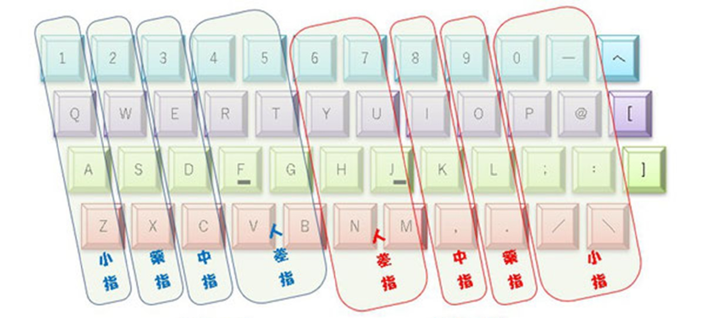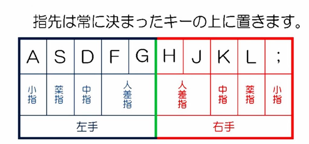 上下のキーを押す時に動きやすくするためです。この位置をホームポジションといいます。指を置く基本の場所です。上段の時には指を伸ばし、下段の時は更にまげて押します。それぞれの指が担当する、上下や左右のキーを押した場合、その指は素早くホームポジションに戻します。