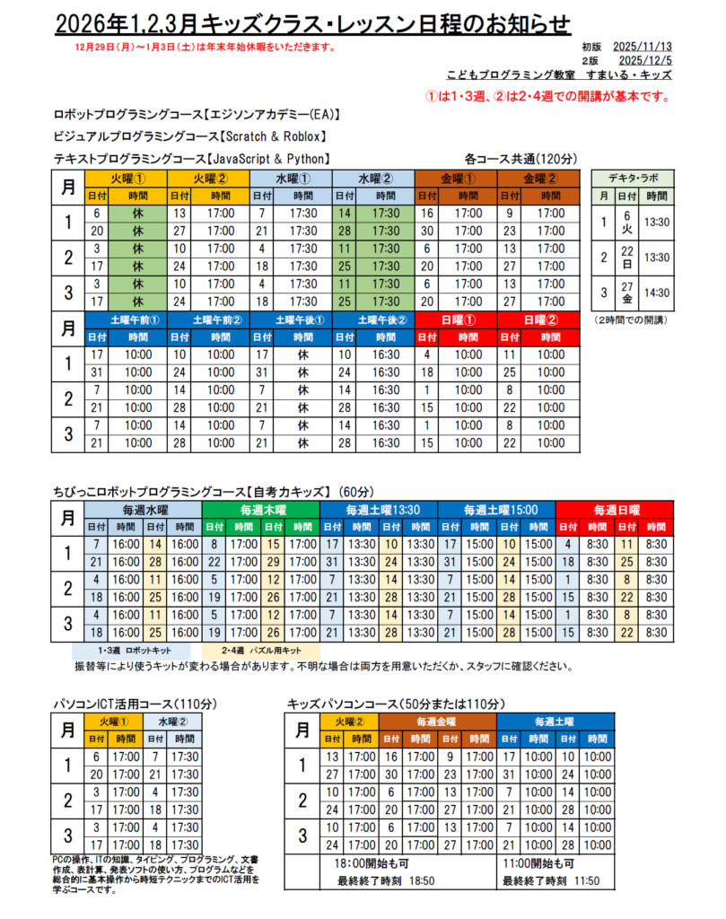 2026年1月~3月のキッズレッスン予定